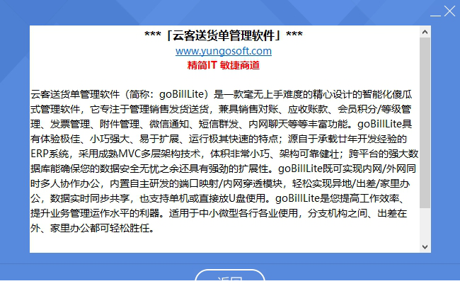 云客送货单管理经常用的软件(简称:goBillLite)是一款功能毫无上手难度的精心设计的智能化傻瓜式管理经常用的软件,它专注于管理销售发货送货,兼具销售对账、应收账款、会员积分/等级管理、发票管理、附件管理、微信通知、短信群发、内网聊天等等丰富功能。goBillLite具有体验极佳、小巧强大、易于扩展、运行极其快速的特点;源自于承载廿年开发经验的erp系统,采用成熟MVC多层架构技术,体积很小巧、架构可靠健壮;跨平台的强大数据库能确保您的数据安全无忧之余还具有强劲的扩展性。goBillLite既可实现内网/外网同时多人协作办公,内置自主研发的端口映射/内网穿透模块,轻松实现异地/出差/家里办公,数据实时同步共享,也支持单机或直接放U盘应用于。goBillLite是您提高工作效率、提升业务管理运作水平的利器。适用于中小微型各行各业应用于,分支机构之间、出差在外、家里办公都可轻松胜任。