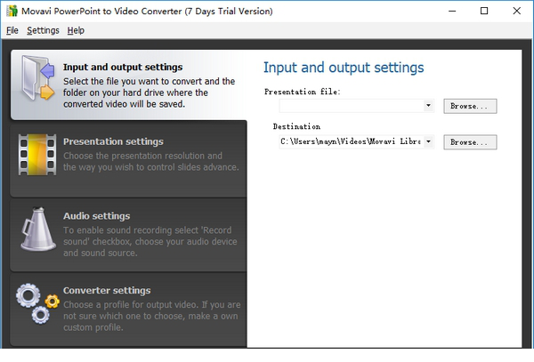 单击“演示文件”字段附近的“浏览”,并选择要转换的PPT文件。如有必要,请更改下面的目标文件夹。