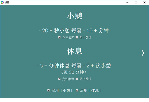 2、默认每10分钟提醒你休息20秒,并且数值是可以调整的