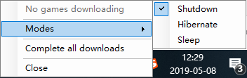SteamShutdown 会自动检测到 Steam 进程,并识别下载任务,你可以选择一个、多个或全部下载任务,然后设置为关机、休眠、睡眠。