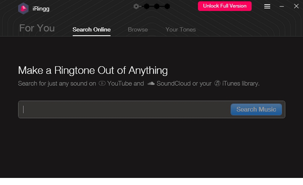 启动 iRingg,主界面 For You 界面会根据用户本机音乐文件的风格来判断用户的视听口味,并从 YouTube 或 SoundCloud 挑取音频或视频文件推送给用户,这就是前面提到的 6-Sense 技术… 选择一个进行铃声编辑记录(如果没有遇到喜欢的歌曲,可以单击右上角的“Suggest More Tracks”换一批推荐歌曲)如果你对经常用的软件推荐的音乐不感兴趣,可以切换到 Search Music 搜索自己的歌曲进行下载,渠道目前仅支持 YouTube 和 SoundCloud。或者如果你有目标歌曲的本地文件也可以直接拖入进来…