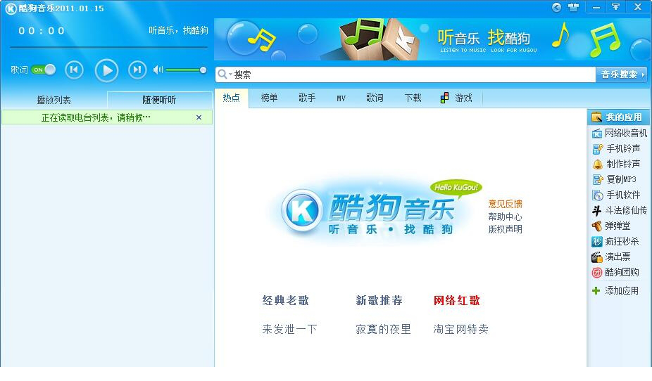 酷狗2011是基于中文平台专业的P2P音乐及文件传输经常用的软件。通过酷狗音乐2011下载的用户可以方便、快捷、安全地实现国内最大的音乐搜索查找,支持高音质音乐文件共享下载,提供Internet的即时通讯与文件交换、传输、共享等网络应用。