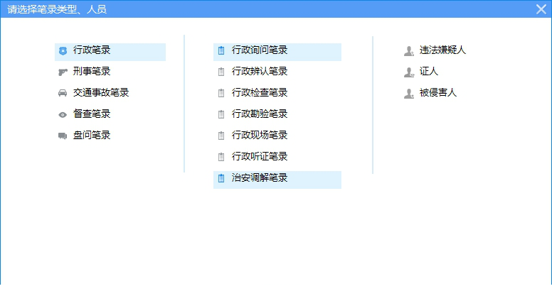 2、选择案件的类型:支持行政笔录、刑事笔录、交通事故笔录、督查笔录、行政询问、行政 辨认