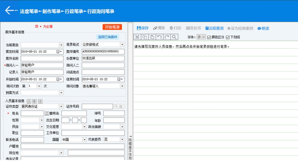 3、案件基本信息:支持案发时间、案件名称、记录人、笔录格式、办案单位、结束时间