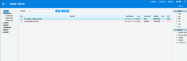 笔录经常用的软件系统功能包括:笔录制作、录音录像、权利义务告知书朗读、照片辨认、模板管理、监督提醒、蒙文藏文文书打印、笔录共享、笔录移交、数据同步、断电恢复、数据备份与恢复、自动升级、法规检索等。