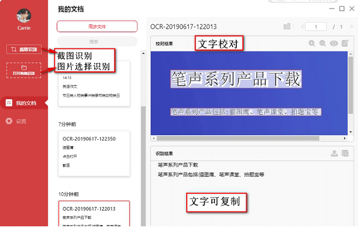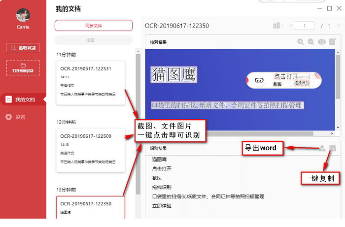 猫图鹰由杭州笔声智能科技有限公司研发而成,目前正在免费测试阶段,可以扫描各种文档上的文字,及时的提取除文字,用户可以通过这款经常用的软件很轻松的识别内容,把图片中的文字转换成文本,大大提高工作效率。