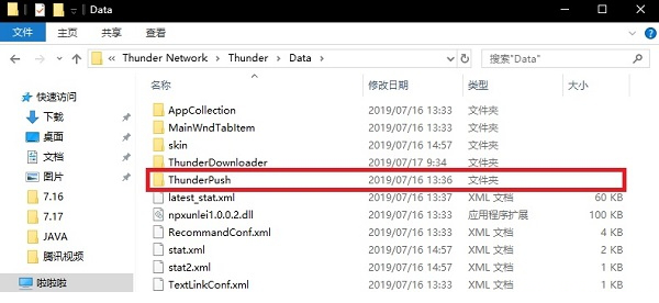 1、进入迅雷极速版安装目录下的【Data】文件夹,先看是否存在【ThunderPush】文件夹,有的话将其删除,然后再新建一个【ThunderPush】文件夹(注意是文件夹),若不存在该文件夹,那直接新建一个【ThunderPush】文件夹即可。