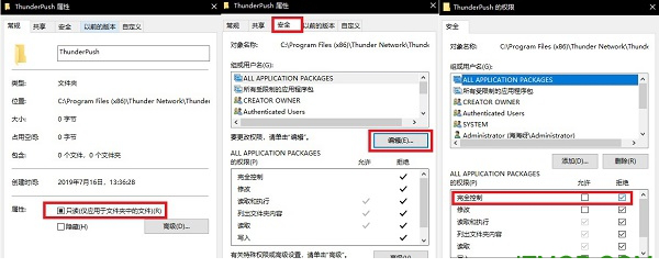 2、右键【ThunderPush】文件夹,选择【属性】,勾选【只读】;然后再【属性】中找到安全->编辑->完全控制,勾选【拒绝】,点击【应用】,再【确定】即可。