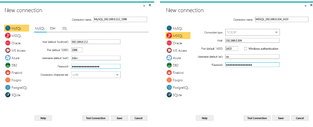 在 “新建连接”窗口中,从支持的数据库列表中选择所需的数据库类型。连接数据库通常需要。IP 地址、端口、用户名和密码。下图以 mysql 源节点和 sql server 目标节点为例。
