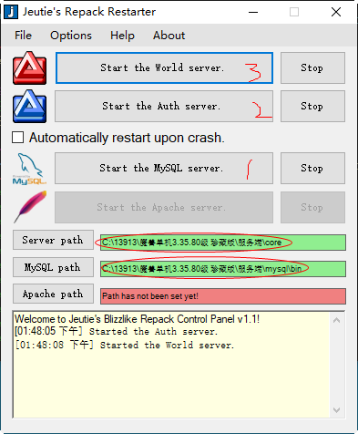 1.运行文件夹里的“mangosd.exe”完成一些数据(约20秒),运行“realmd”打开就行,不需要等。注意:这两个程序不要关,一直开着
