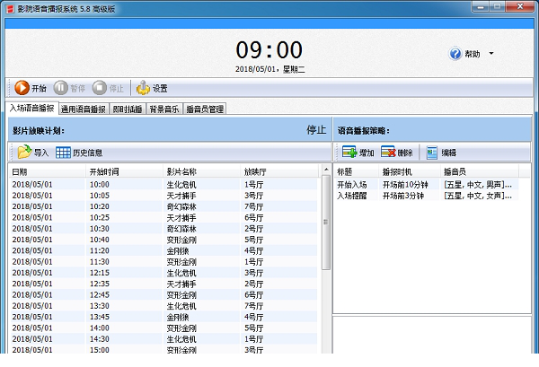 * 影院专用的语音播音经常用的软件,只需导入每天的影片放映时间表,即可进行全自动的语音播报
