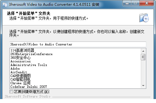 4.选择在开始文件夹创建快捷方式,点击安装