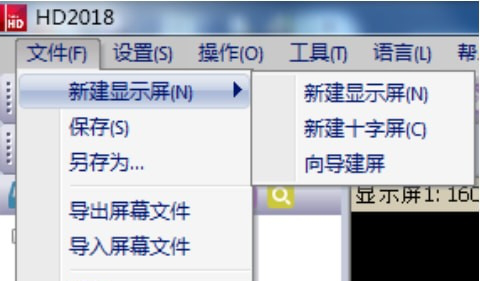包含新建显示屏、保存、另存为、导出屏幕文件、导入屏幕文件、退出等六个选项,如图: