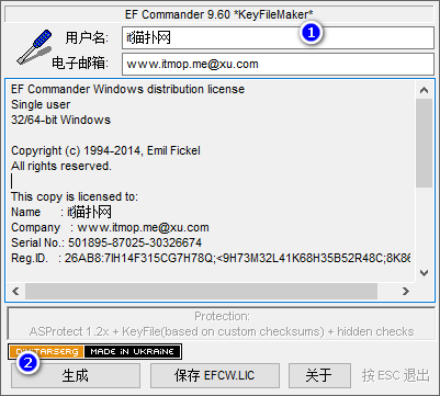 文件/文件夹管理经常用的软件 EF Commander 解压出来,然后打开注册机,填写用户名和电子邮箱,点击生成就可以,然后保存EFCW.LIC