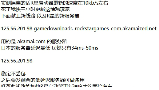 R星用上了新服务器,因此也多了几条新线路,其中有一条更新专用线路,经测试修改其线路可以增加R星启动器更新速度一倍左右