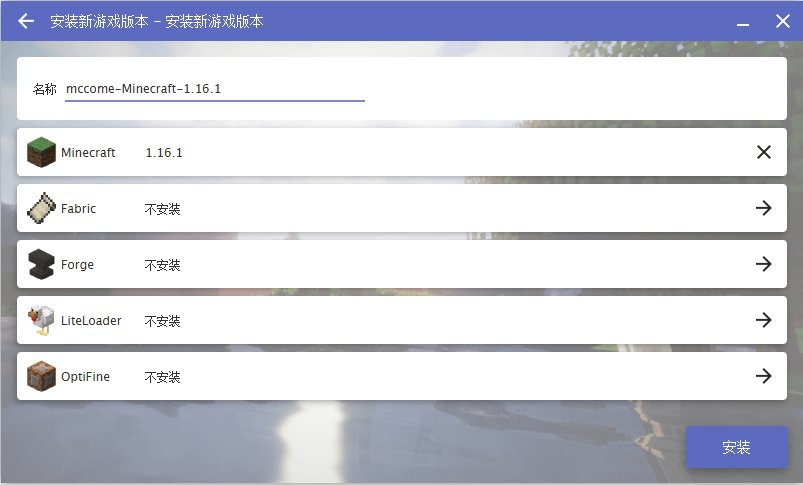 以Minecraft1.16.1版本为例,如下图,给游戏起个喜欢的名字,点击下方的安装,游戏就开始下载了;同时如果需要安装Fabric、Forge、LiteLoader、OptiFine的话,可以选择其他四个选项安装。