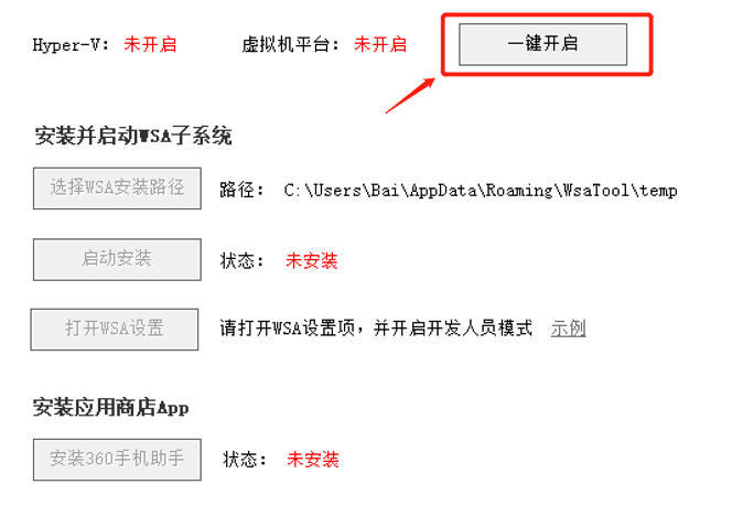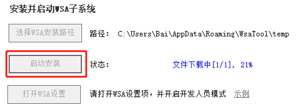 第二步:重启电脑后,再次打开Win11安卓助手,设置路径后点击【启动安装】即可开始下载WSA子系统。