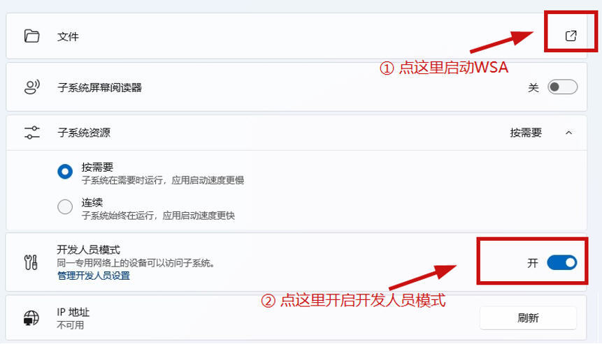 待状态变成“已安装”,点击【打开WSA设置】,根据【示例】进行配置。