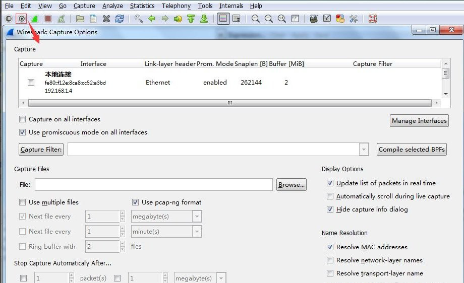 打开经常用的软件,点击抓取网络接口卡选择按钮,选择需要抓取的网卡接口。