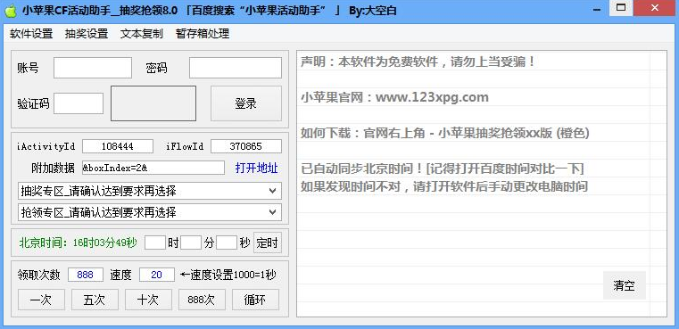 小苹果抽奖抢领是一款功能强大的CF辅助工具,其主要功能就是帮助玩家们抢领,手速慢的玩家们借助这款软件绝对的得心应手。软件内活动数据自动更新,完美支持最新活动,目前主要支持CF活动抽奖,还有支持逆战、使命召唤等游戏活动的抢领!