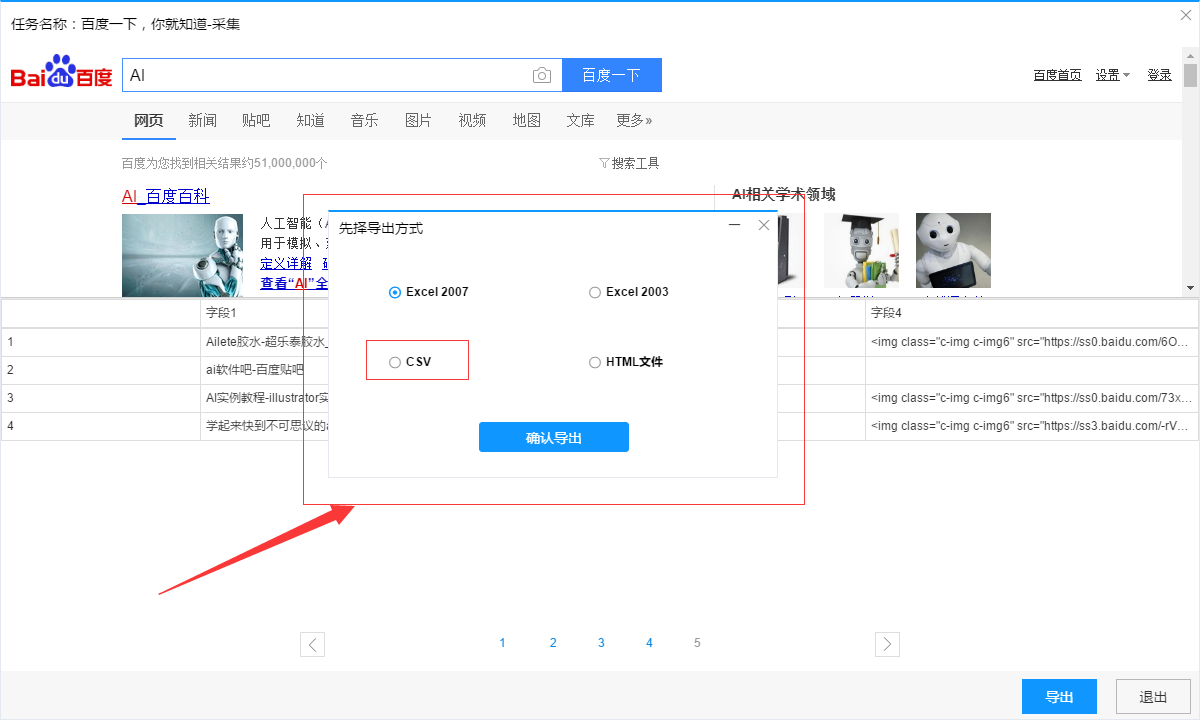 3)选择“导出方式”,将采集好的数据导出,这里可以选择excel作为导出为格式
