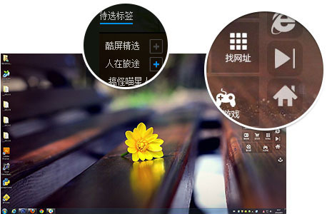 酷屏是款集成壁纸、主题资源于一体,自动播放更换壁纸的桌面美化软件,软件提供大量的壁纸和主题,操作简单。酷屏不仅集成近海量的XP电脑主题、Win7主题、桌面壁纸、电脑登陆界面、鼠标指针、桌面屏保、文件夹图标等桌面美化资源。还提供:CMD查询、计算机、视频播放器、图片播放器、浏览器、桌面清理、桌面事件等精美桌面应用,酷屏使您的Windows桌面更加实用和多彩。