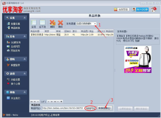 输入天猫或淘宝商品单品地址,一键转换为你的淘客链接,并下载商品图片;通过转换后的淘客信息进行二次筛选。