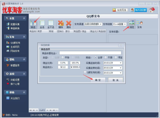 1、从已经采集入库上淘宝客信息中筛选你需要发布的淘宝客信息可设置商城、佣金比例、商品现价、采集时间段等参数进行筛选。