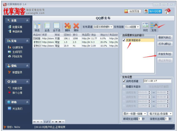 选择你所需要发布的QQ群,可选择商品图片、发布标题、淘客链接顺序;设置每次发布淘客条数(1-3条);多个群间发布时间间隔;单群发布信息时间间隔。