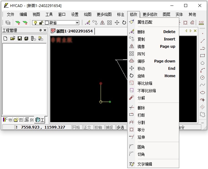删除、复制、移动、等比放缩、非等比放缩、镜像、阵列、旋转、分段(等分)、分割(切割)、断开、分解、截断、延伸、圆角、切角、连接、点取边界、轮廓生成、区域生成、区域并、区域交、区域减、文字编辑。