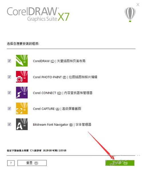 6、进入软件安装程序选择界面,您可以根据自己的需求决定您要安装的软件,有矢量插图和页面布局、位图插图和照片编辑、内容查找器和管理器、高级屏幕截图和字体管理器。小编建议新手只安装矢量插图和页面布局就可以了,选择完成后点击【下一步】。