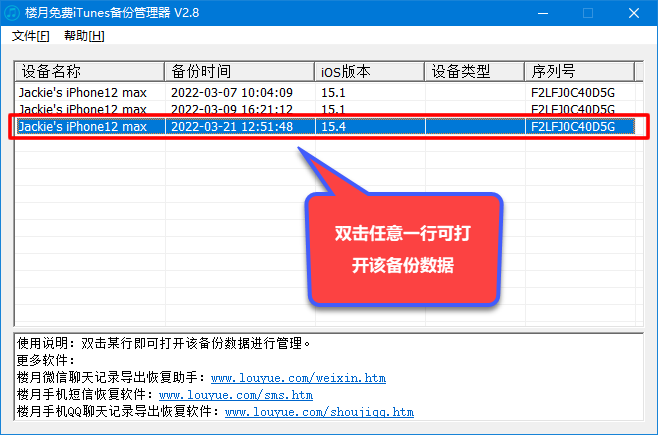 第2步:备份结束后,安装并运行“楼月免费iTunes备份管理器”软件,该软件主窗口上将会显示所有以前备份到该电脑上的苹果设备备份数据,双击想查看的任意一行可将其打开。