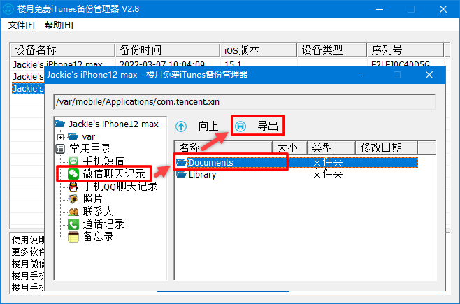 第3步:在弹出窗口上就可以看到该备份数据中的所有文件了,可以导出任意我们需要的文件,如下图中为对手机微信数据进行导出。