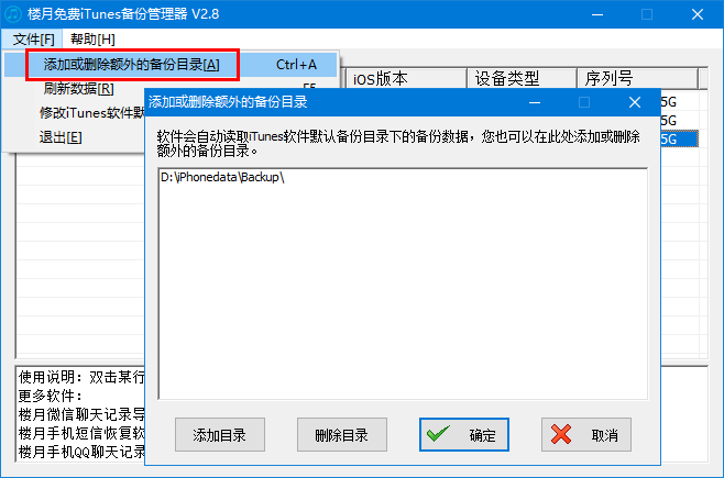 点击“文件”,“添加或删除额外的备份目录”菜单后会弹出设置窗口,在该窗口中可以添加由其它软件备份的苹果手机数据目录。