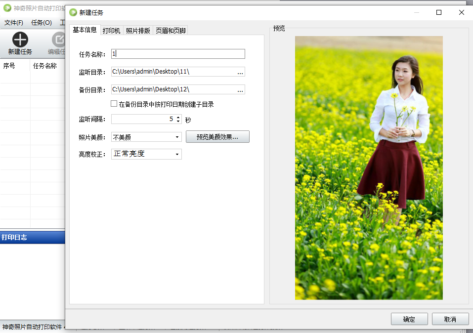 1.点击“新建任务”,命名任务名称,选择监听目录和备份目录,设置监听间隔时长,设置亮度及美颜程度: