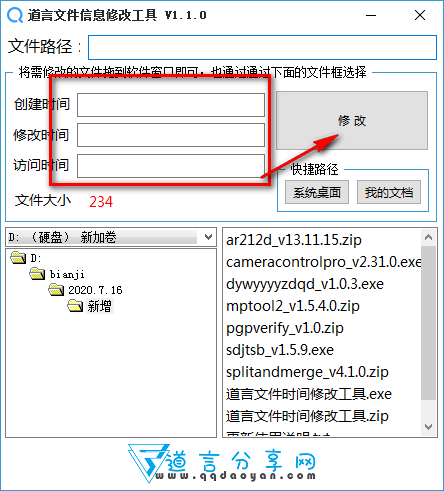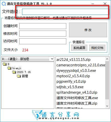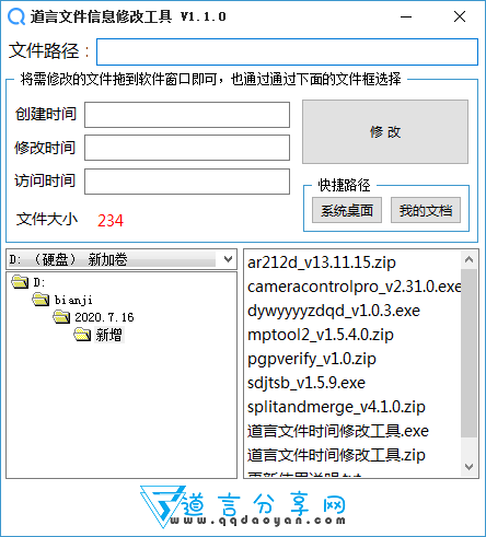 道言文件信息修改工具是非常多的人都在使用人用的一款非常方便非常实用的文件修改工具,支持修改文件基本信息、文件夹最后打开时间、文件创建时间,操作方法也十分简单,接下来小编就给大家带来这款软件的具体介绍,感兴趣的小伙伴们速来看看吧~~