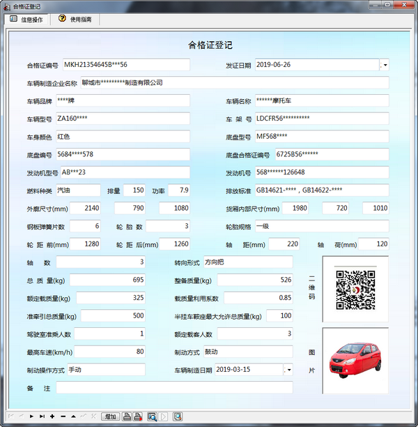 合格证登记、按车架号查询、按合格证编号查询、按发动机型号查询。