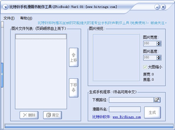 比特铃手机漫画制作工具是非常多的人都在使用人用的一款非常实用的手机漫画制作软件,能够帮助用户非常方便快捷地将电脑中的图片文件转换成JAVA图书的JAR文件包,非常方便支持JAVA的手机进行下载。接下来万能驱动网小编就给大家带来这款软件的具体介绍,感兴趣的小伙伴们速来看看吧~~