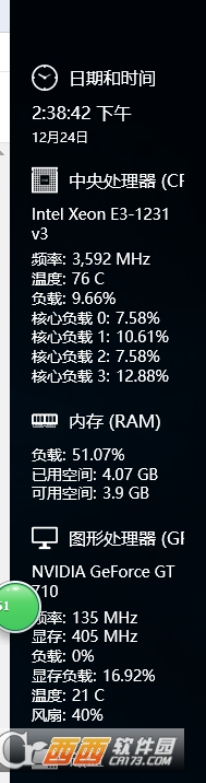 Sidebar Diagnostics能够监控和显示的硬件信息非常多,包括时间、日期、cpu的型号、温度、负载、网络IP地址、上传下载速度、内存使用率、显卡的型号、负载、温度、风扇转速,每个分区硬盘使用量、读写速度等信息。