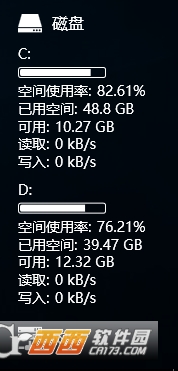 7、空间使用率:82.61%、已用空间:48.8GB、可用:10.27GB、读取:0kb/s、写入:34.19kB/s