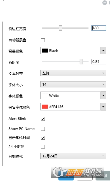 11、自定义功能,侧边栏宽度、自动背景色、背景颜色、透明度、文本对齐、字体大小、字体颜色、警告字体颜色、 Alert Blink、 Show PC Nam、显示系统时间