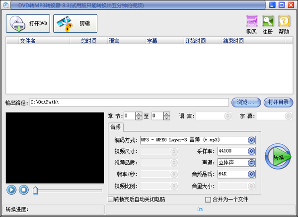 DVD转MP3转换器是易杰推出的非常多的人都在使用人用的一款功能强大的专业DVD光盘输出音频转换工具,支持DVD光盘中提取音频为 MP3/WMA/WAV/AAC/AMR/M4A 等音频格式,还可以单独从DVD光盘中提取想要的精彩片段,也可以把多个片段合并输出一个文件,简单易用,接下来万能驱动网小编就给大家带来这款软件的具体介绍,感兴趣的小伙伴们速来看看吧~~