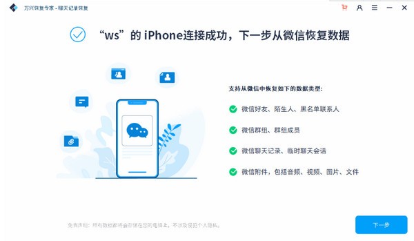 运行【万兴恢复专家 - 聊天记录恢复】这款软件,将苹果手机通过数据线连接到电脑上,待程序识别到iOS设备之后,然后点击右下角的【下一步】按钮进行扫描工作。