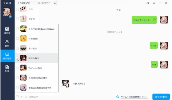 微信数据扫描工作完成后会进入到一个类似于桌面端微信的新界面,左侧按照微信数据类型分为【微信通讯录】【微信群组】【微信聊天记录】【微信附件】。在左侧菜单栏按照自己的需求进行切换,由于要恢复的是微信聊天记录,所以直接切换到第三个就可以了;在该菜单下可以逐一切换好友聊天记录来进行查找,确认之后直接勾选并点击右下角的“恢复到电脑按钮”即可完成苹果微信聊天记录恢复的操作了。