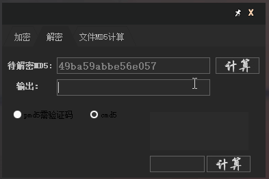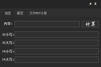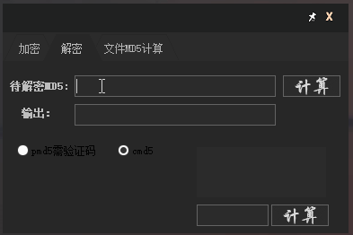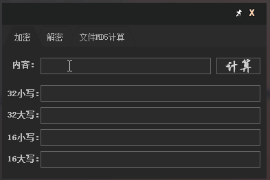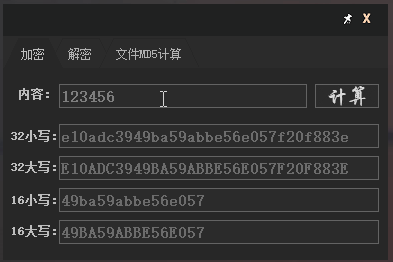 首先是加密,输入一个文本,点击计算,就能得出32、16位大小写的MD5值。鼠标左键点击即可复制。