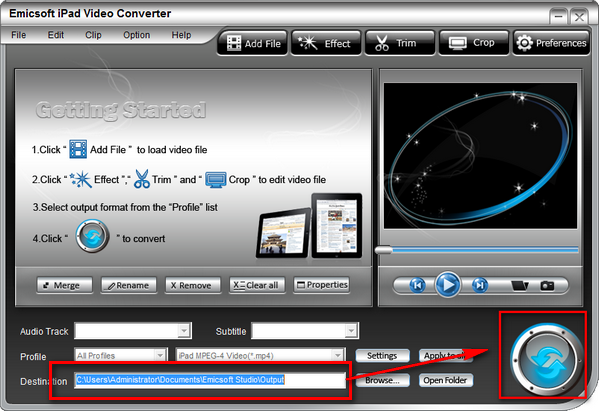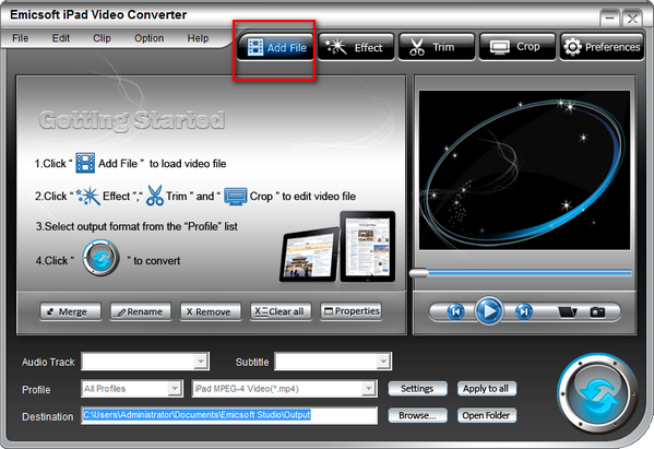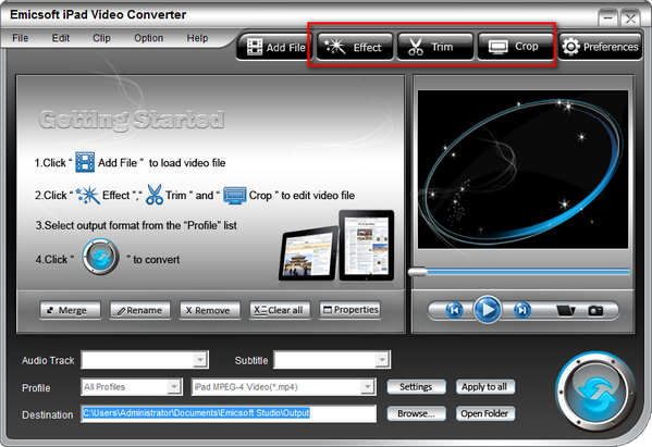 Emicsoft iPad Video Converter还可以将一个文件分割成多个小片段。从视频中捕获图像;更改视频宽高比;调整播放效果;将文件合并为一个;添加图像/文本水印。它支持多核处理,多线程和批处理转换。您也可以根据需要修剪和裁剪视频。