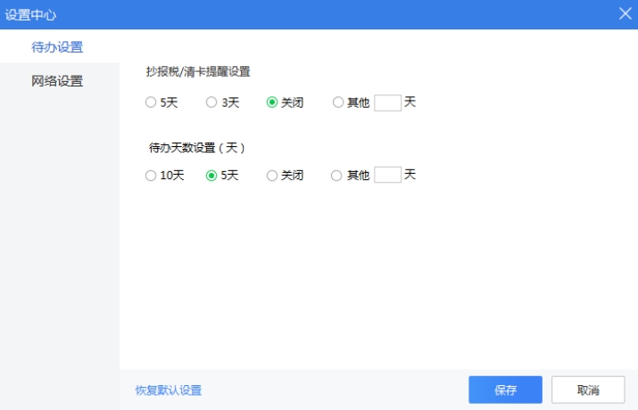 待办设置包含 2 个功能抄报税/清卡提醒设置和待办天数设置。