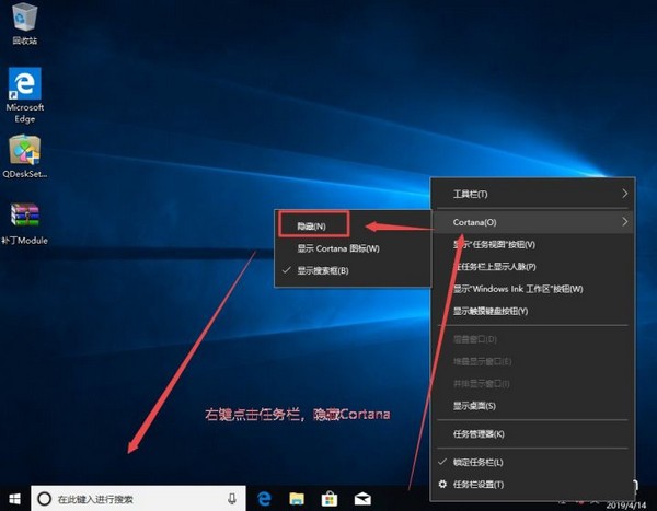 1、首先隐藏任务栏的Cortana,因为小Q书桌的图标还是会覆盖在cortana上