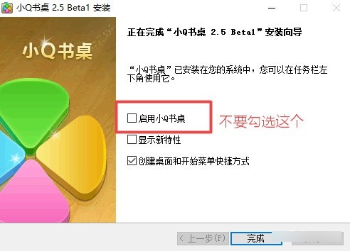 2、安装QDeskSetup-2.5.1278.201.exe,一直下一步,安装完成后不要勾选启用小Q书桌选项,因为一旦启用小Q书桌,就会自动加载注入模块,导致待会替换注入模块的时候提示文件正在被使用。如果你不小心点了启用小Q书桌,那么请在任务管理器里关闭小Q书桌并重新启动Windows资源管理器即可。