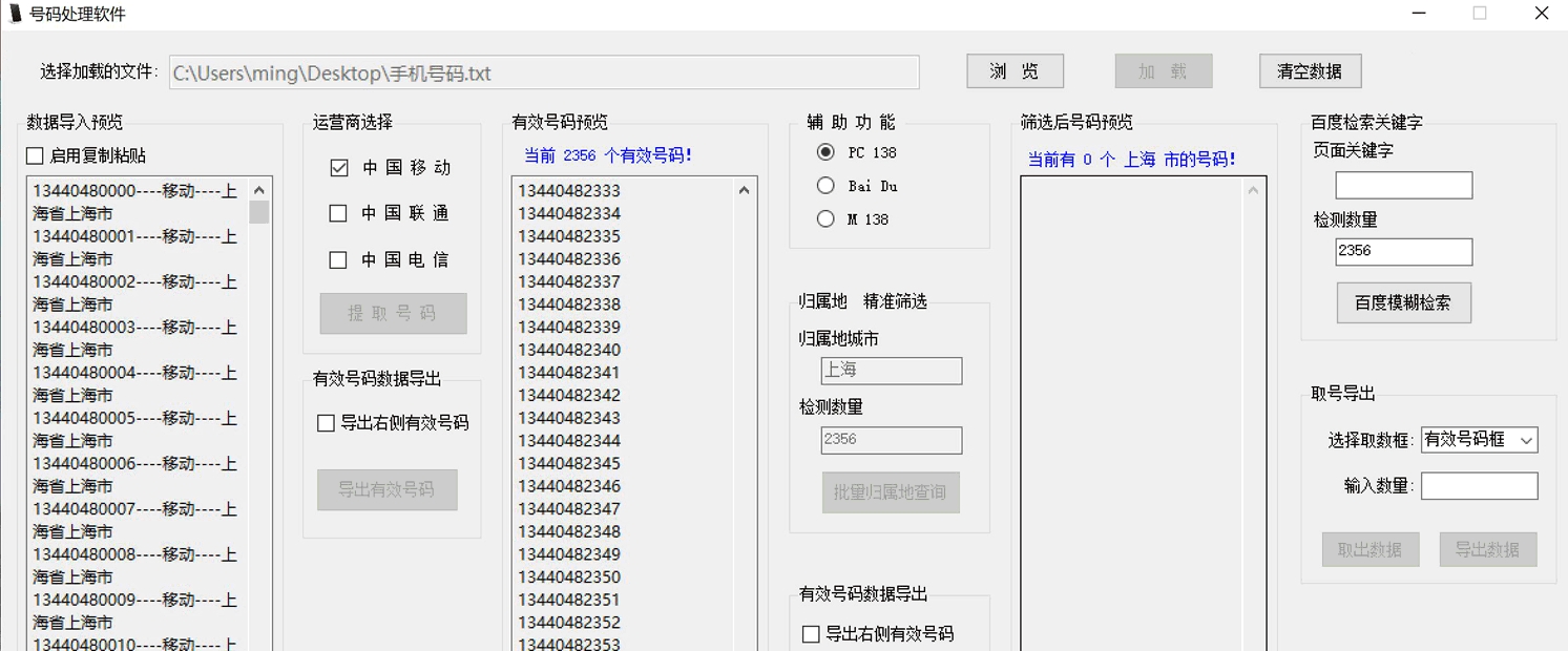 你可以从本地导入手机号文档,从中筛选出不同运营商、归属地等符合条件的号码,并且可以直接导出为txt文档。